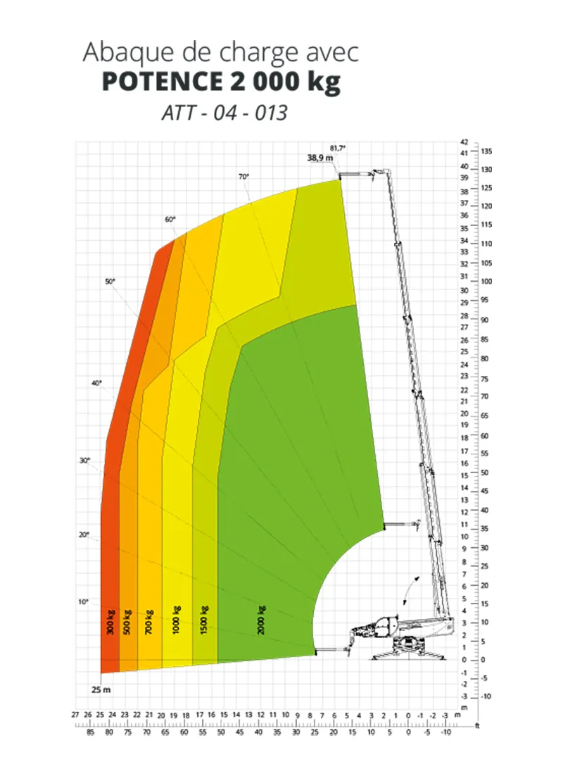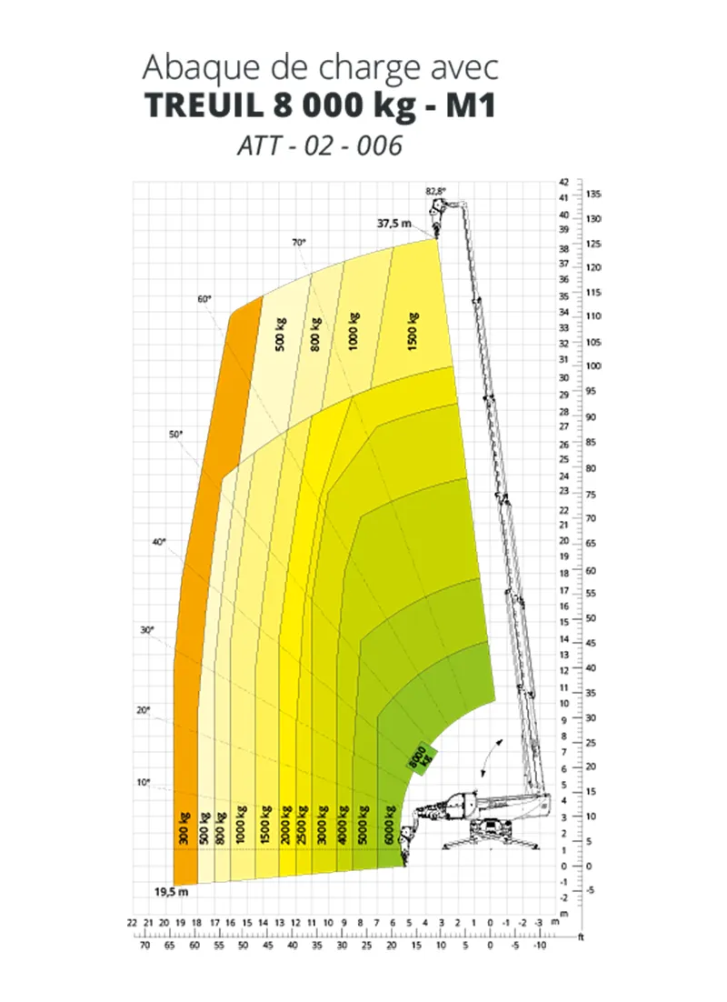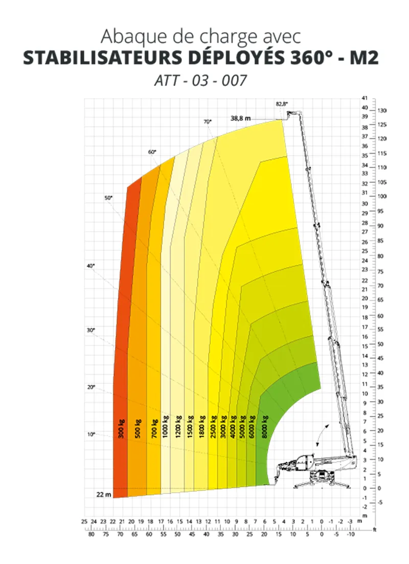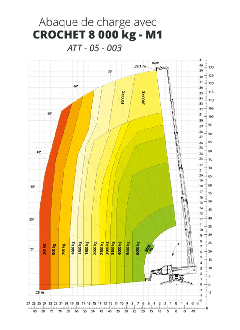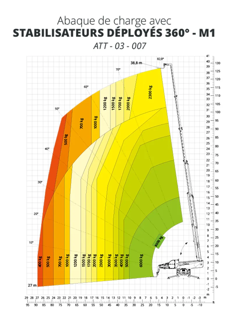 - Mode M2 : Réduction de portée pour soulever des charges maximales de 8 tonnes dans des conditions spécifiques.